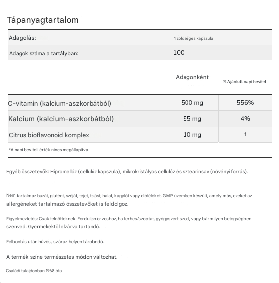A C-vitamin egy vízben oldódó tápanyag, amely jól ismert az immunrendszerben betöltött létfontosságú szerepéről.* A C-vitamin a kollagén (a kötőszövetben található strukturális fehérje) termeléséhez is szükséges, ezért fontos a bőr, a csontok és az ízületek egészségéhez.* A C-vitamin szükséges az aminosav-anyagcseréhez, az ingerületátvivő anyagok szintéziséhez és számos tápanyag, például a folsav és a vas hasznosulásához.* Emellett rendkívül hatékony antioxidáns, amely segíthet fenntartani az egészséges szöveteket azáltal, hogy semlegesíti a normál anyagcsere és a környezeti stresszoroknak való kitettség során keletkező szabad gyököket.* Ez a termék kalcium-aszkorbátot tartalmaz, a C-vitamin pufferelt formáját, amely biológiailag hasznosul és nem savas; bioflavonoidokkal van gazdagítva, amelyek szinergikusan működnek a C-vitaminnal.*