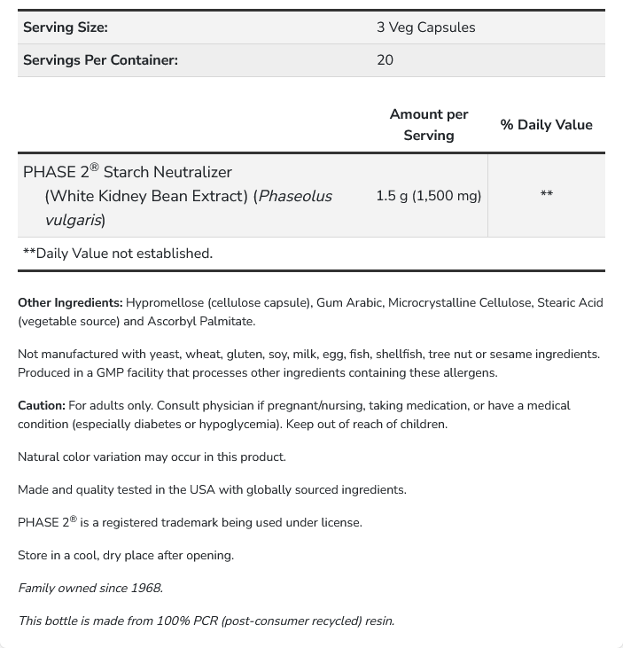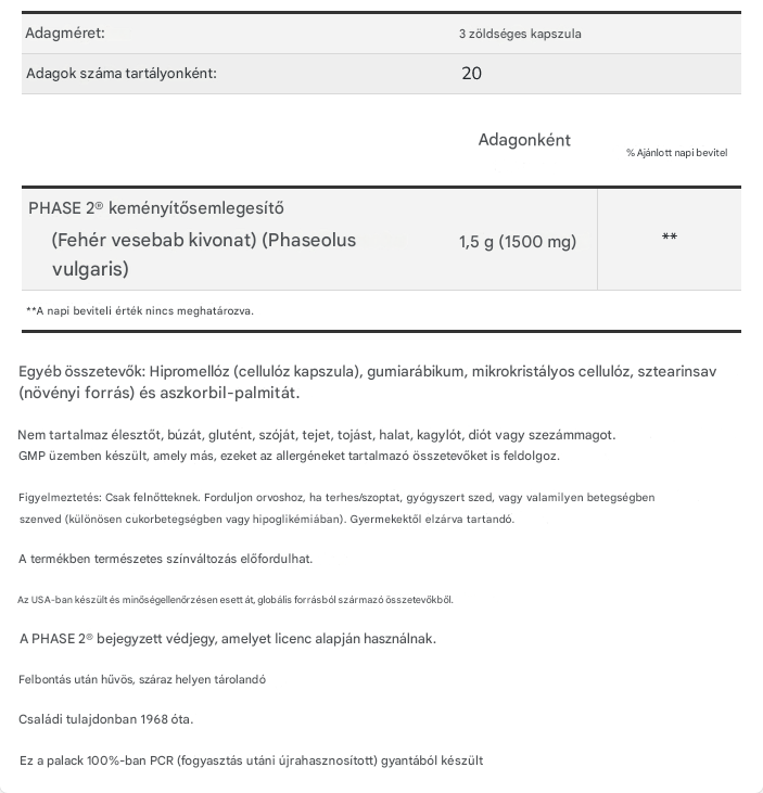 A PHASE 2® egy nem stimuláns fehér vesebab kivonat, amely segíthet késleltetni az étkezési keményítők lebontását azáltal, hogy korlátozza az alfa-amiláz emésztőenzim működését.* Az enzim aktivitásának csökkentésével a keményítőből származó szénhidrátok felszívódása és hasznosulása is csökkenhet.* Tanulmányok kimutatták, hogy ha a PHASE 2®-t ésszerű étrendet és testmozgást is magában foglaló fogyókúrás programok kiegészítéseként használják, az segíthet a testsúlyszabályozási célok elérésében.* A termékben természetes színváltozás előfordulhat.